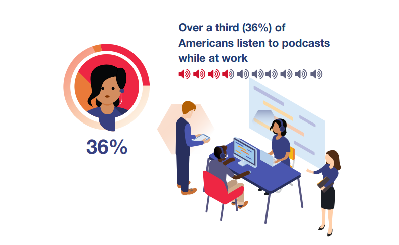 Podcasts aren’t just a leisure time activity. Where there’s a mobile phone, there’s potential for a podcast. Podcasts are so distinct from other media forms as they can be entirely hands-free, don’t require the consumer to be in one place, and don’t lose any value if the listener can’t simultaneously be looking at a screen. An individual can seamlessly move through their day and listen to podcasts as they go about their life. Podcasts become a welcome companion to a listener and an enhancement to the working day. They may even feel like a much-needed escape.