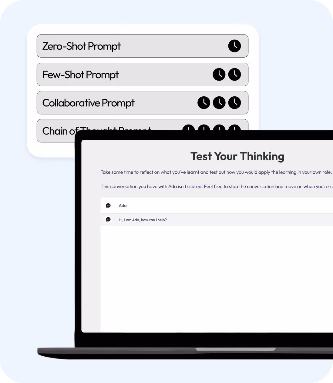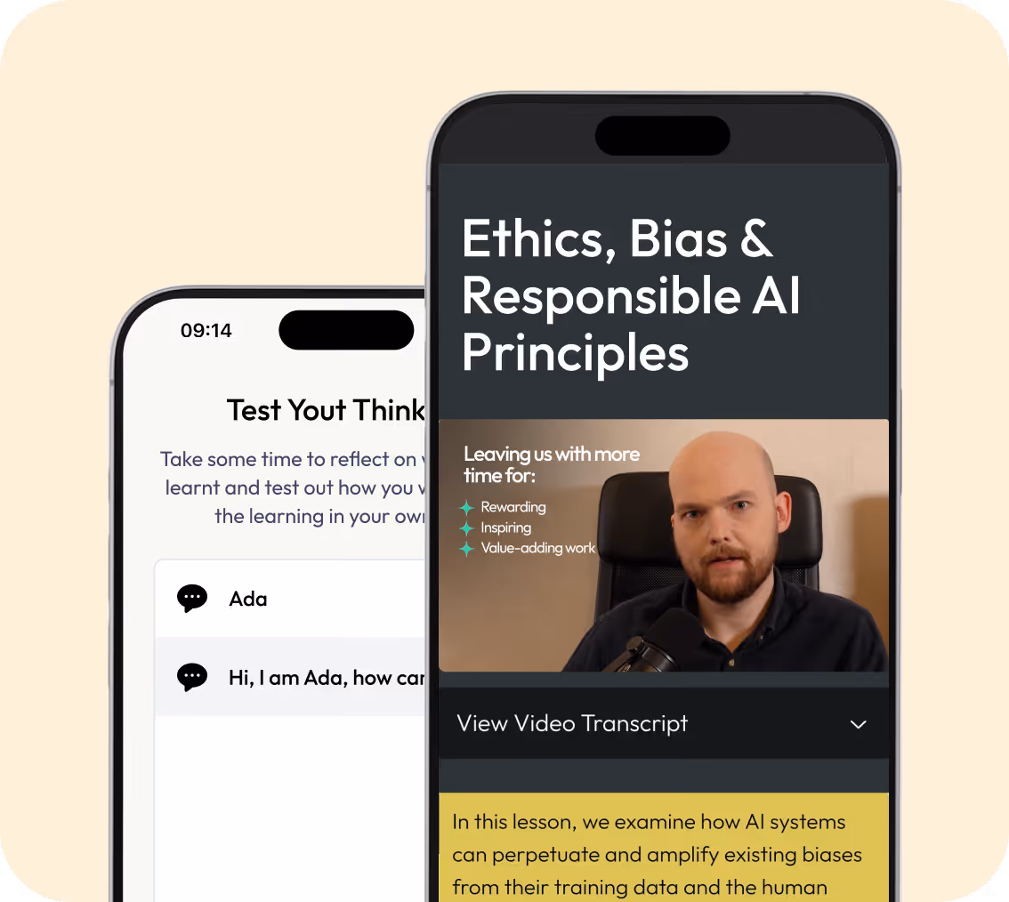 Ada - the built-in AI learning companion - challenges, questions and responds throughout every lesson. Learners don’t sit through videos. They think, apply and build confidence as they go.